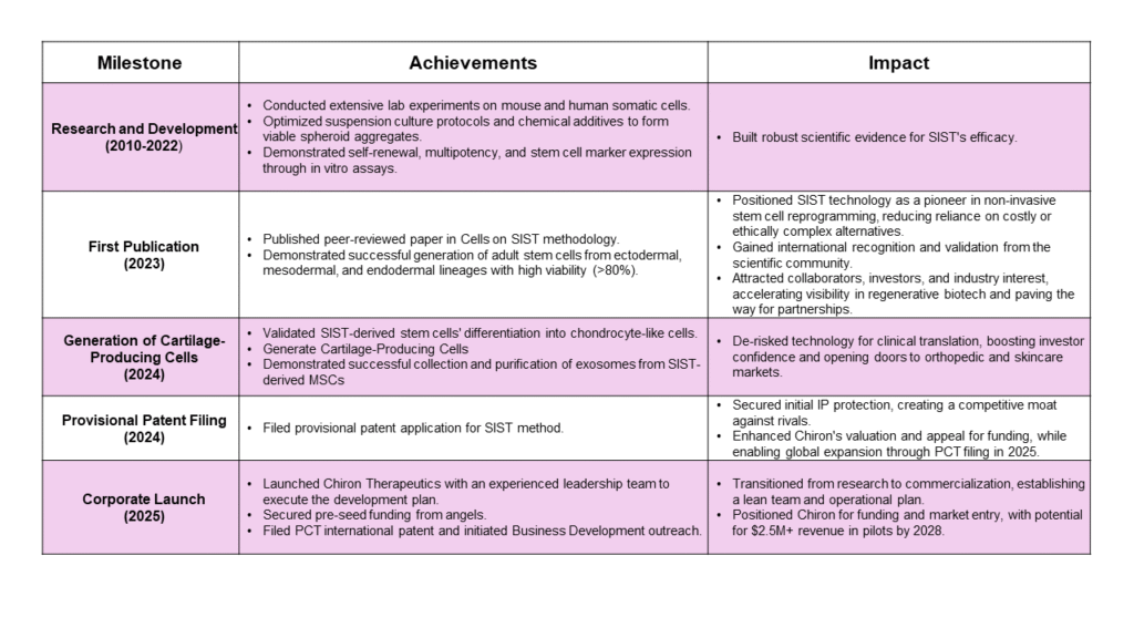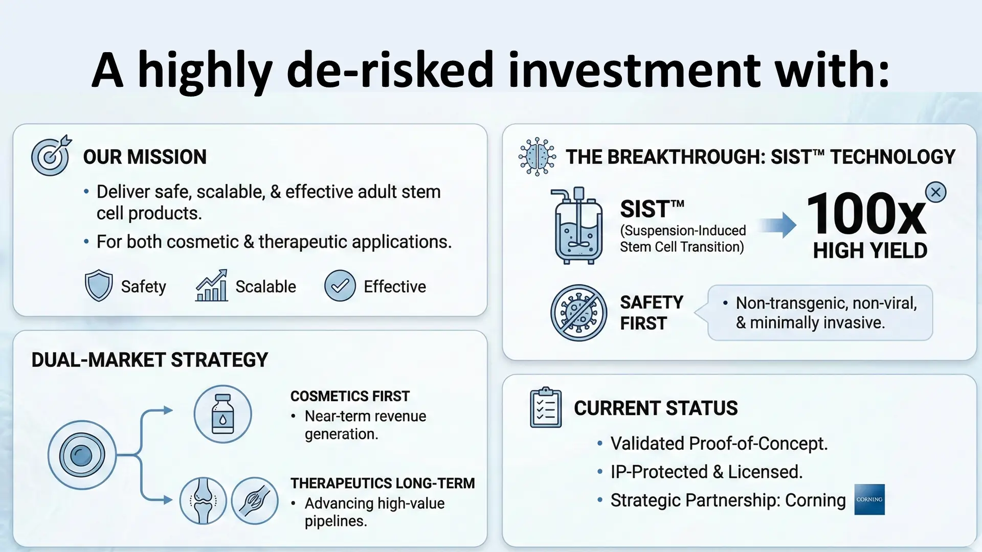 The investment is supported by a proven, non‑transgenic SIST method for high‑yield, scalable adult stem cell production, protected by a secured PCT international patent filing, with ongoing enhancements to optimize exosome purity and yield.